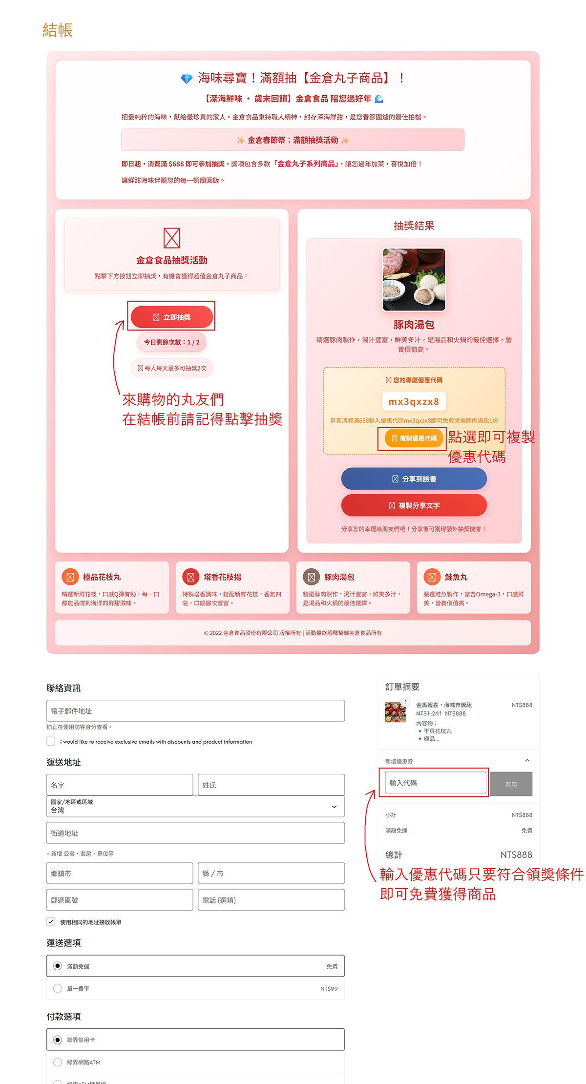 想要免費品嚐金倉人氣丸子嗎?跟著以下步驟參與「海味尋寶」活動,只要下單滿額 $588,好禮代碼輕鬆拿!